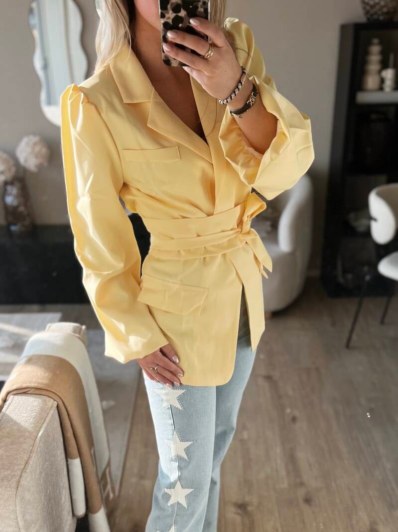 Hoe prachtig is deze blazer! Je kunt het ceintuur er omheen dragen maar het kan ook zonder. Hij valt een. maatje kleiner. Hij is qua kleur perfect te combineren met de gele pantalon.
