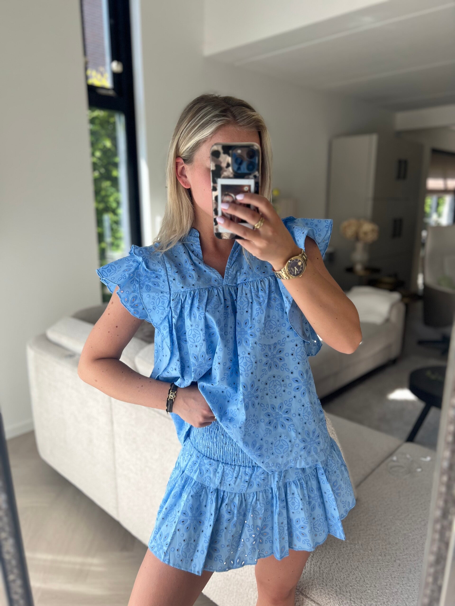 Hoe leuk is deze skort! Bijpassend bij de blauwe broderie top. Hij valt een maatje kleiner.
