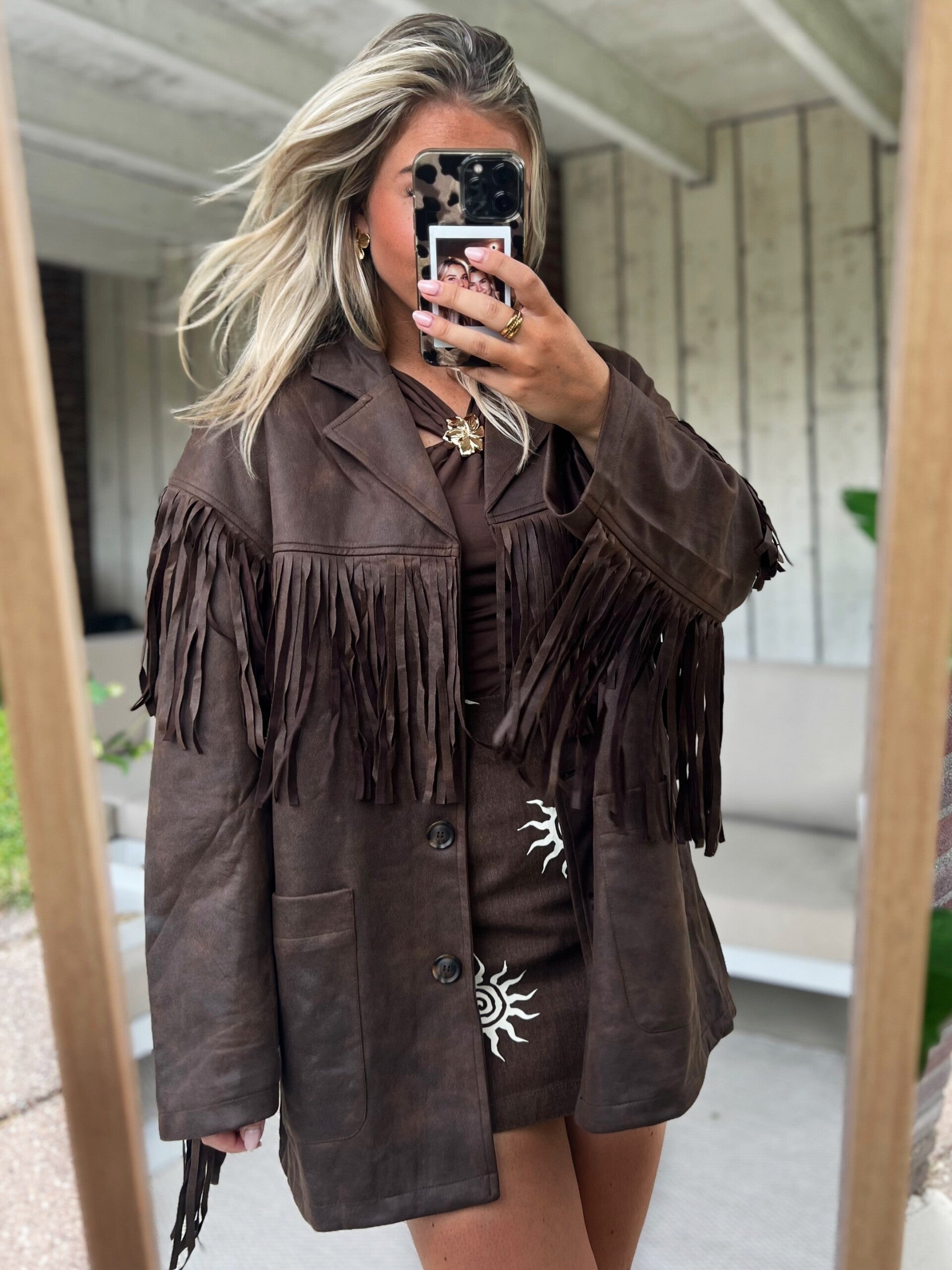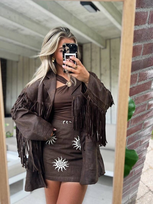 Heb jij nog een festival dit seizoen? Dit geweldige statement item kan dan niet ontbreken in je kast. Het is een oversized model. De jas valt op maat. Er zitten franjes aan de voorkant, achterkant en aan de mouw.