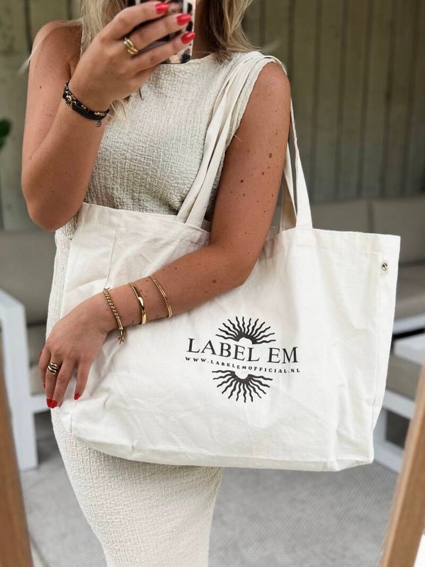 Hoe geweldig is deze shopper! Hij is lekker ruim. De afmetingen zijn 47x37 cm. Het is 80% katoen en 20% polyester. Hij is erg stevig. Het logo is donkerbruin.