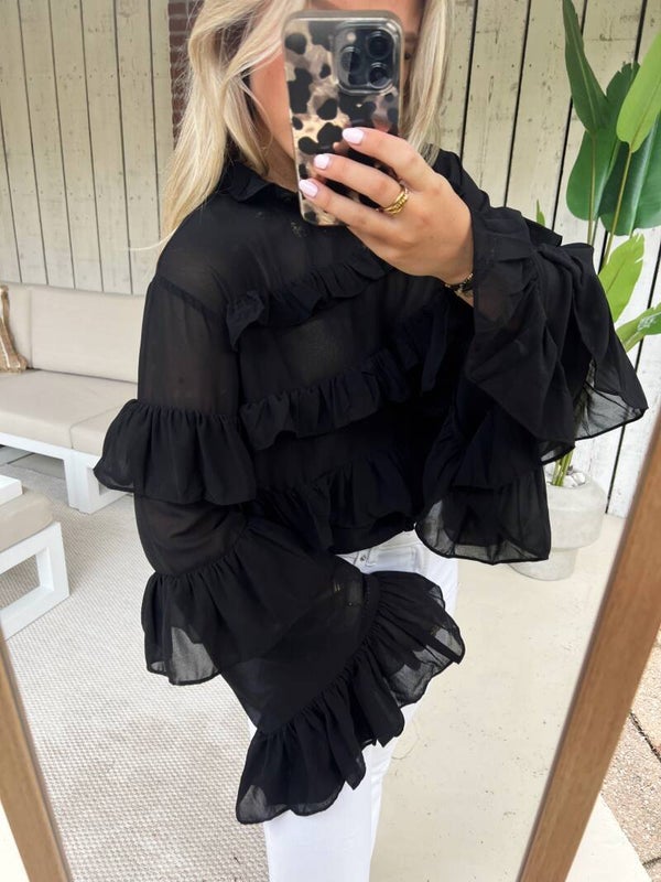 Deze fantastische blouse is echt een goeie basic die overal bij past. Door de ruffles is je outfit gelijk helemaal af. De blouse valt op maat.