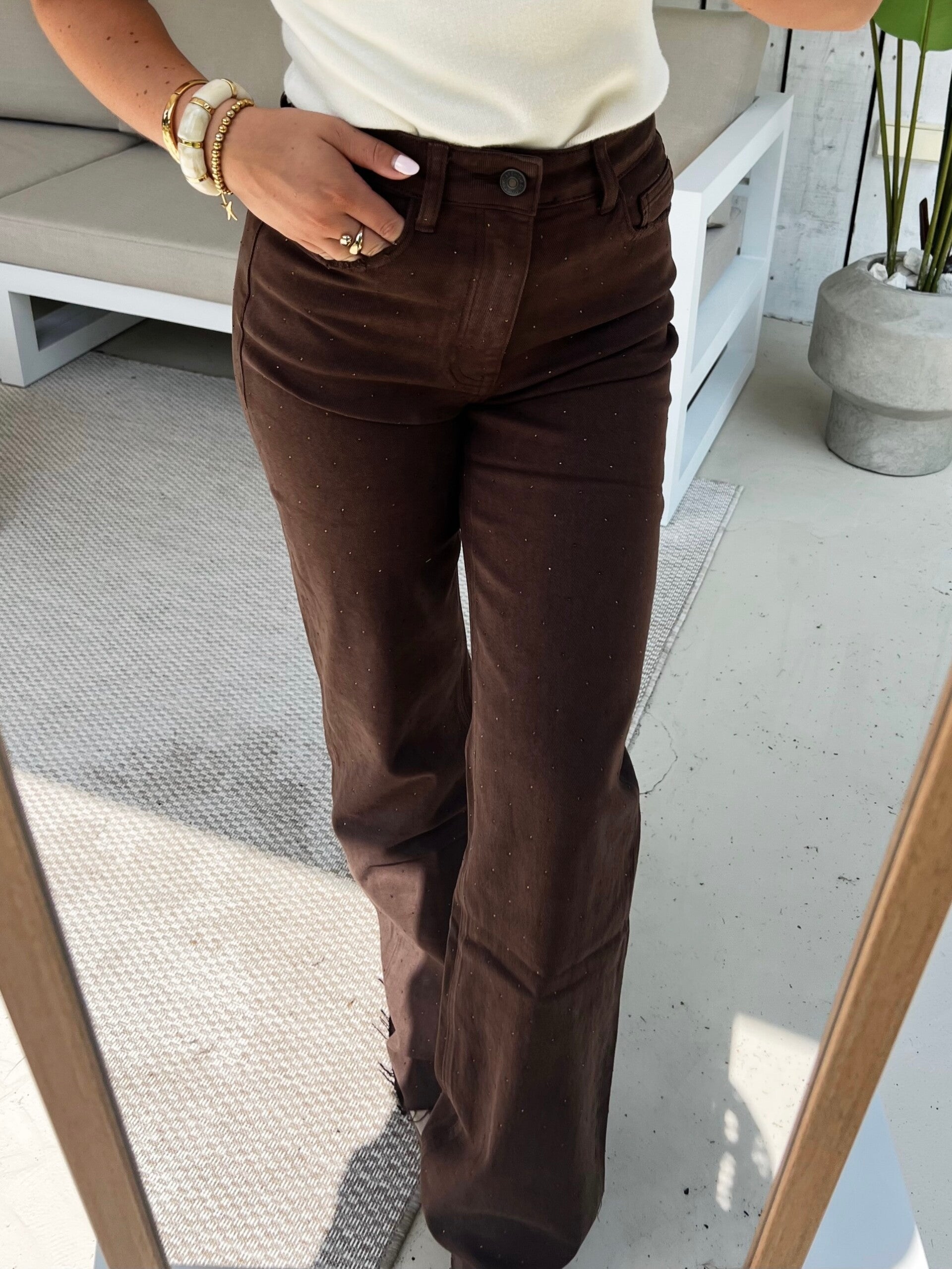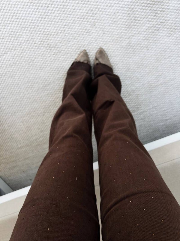 We hebben weer een musthave voor dit najaar! De bruine jeans. En deze heeft ook nog hele mooie subtiele strass steentjes. Hij is extra tall met een afknipbare onderkant.