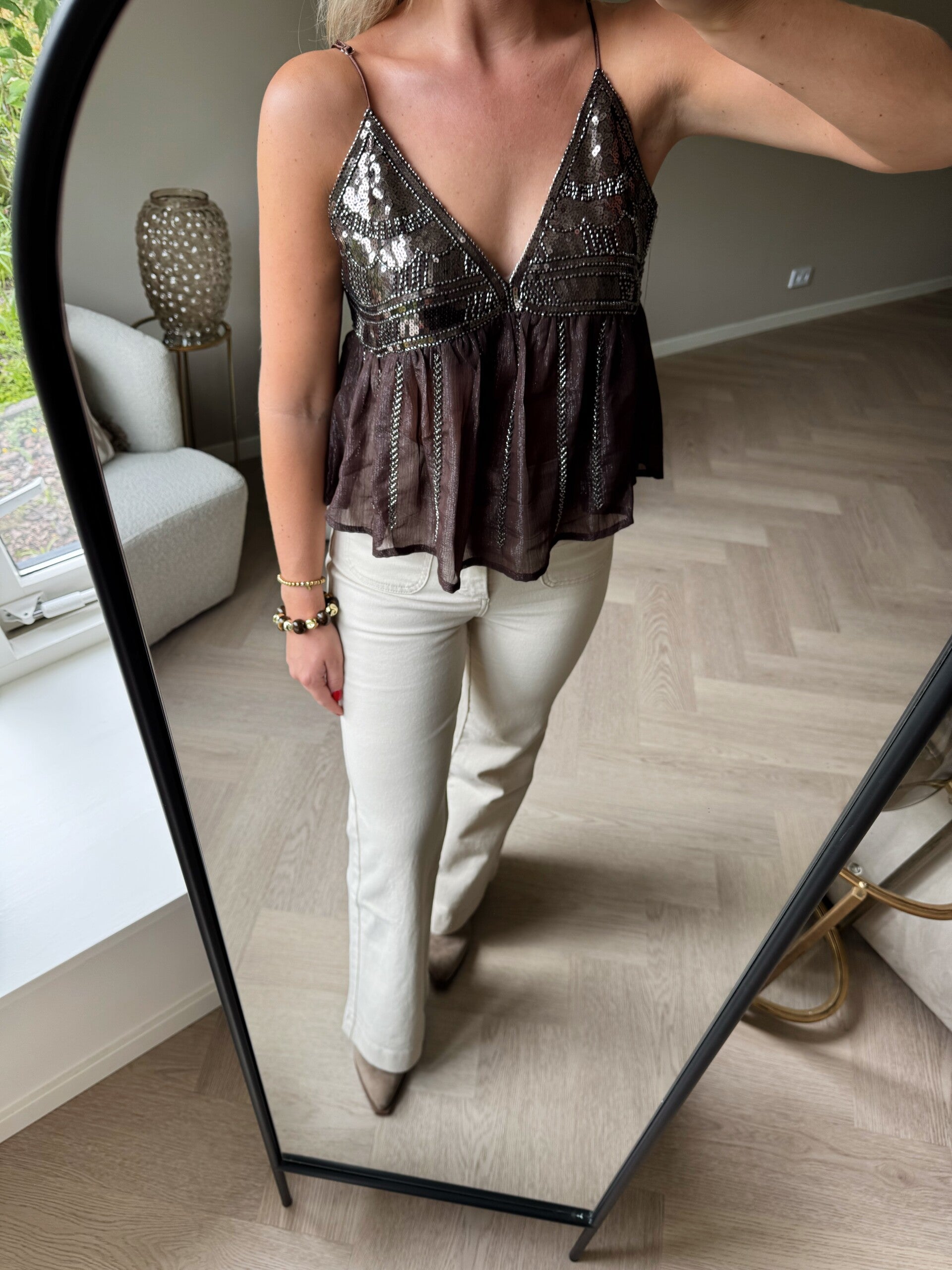 Dit super leuke topje is met bijna alle maten goed te dragen omdat de bandjes verstelbaar zijn. Qua omvang valt hij op maat. Super leuk te combineren met de zandkleurige jeans.