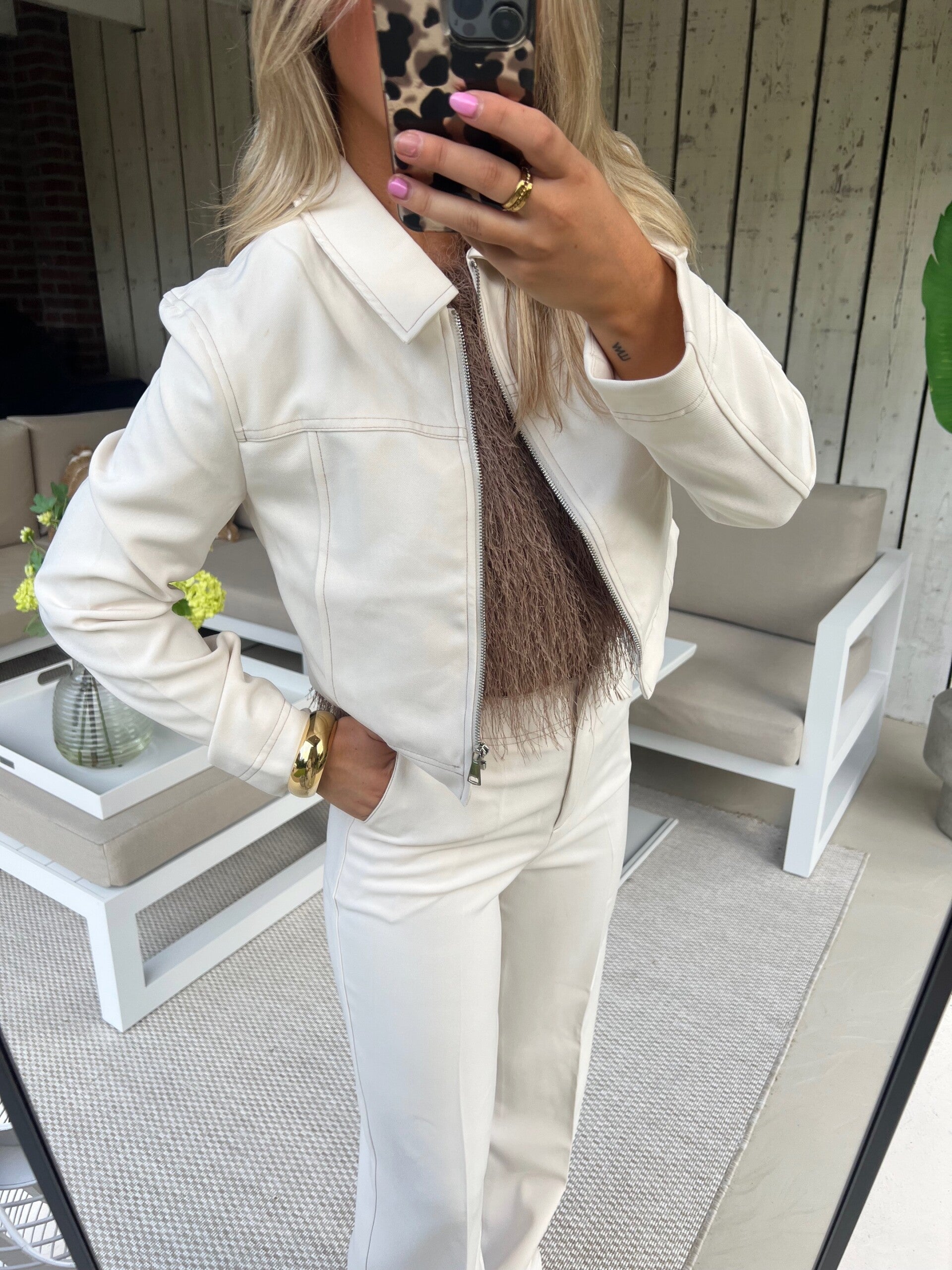 Dit super leuke jasje is een beetje cropped en heeft een ritssluiting. Super leuk te combineren met de bijpassende broek. Het jasje valt een 1,5 maat kleiner. De S/M valt als XS.