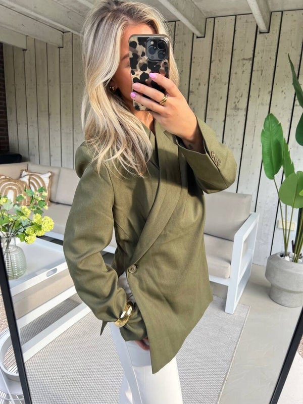 Deze mega leuke blazer heeft een grote overslag en is met een knoop aan de binnenkant en aan de buitenkant te sluiten. Het model op de foto draagt normaal XS en op de foto een S.
