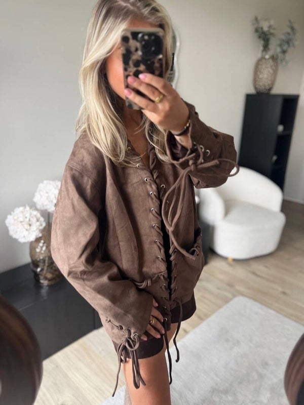 Dit geweldige jasje is one size en te dragen van XS tm M. Hij heeft super leuke details zoals de veters op de zakjes, mouwen en boord. Het is een geweldige kwaliteit en heel leuk te dragen over een basic jurkje.