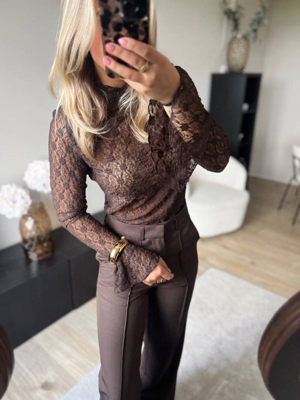 De kanten top is terug! Super leuk onder een blazer of een trui. Hij valt op maat en heeft een uitlopend mouwtje en een hogere hals. Er zit stretch in de stof. De top is van het merk Ambika.