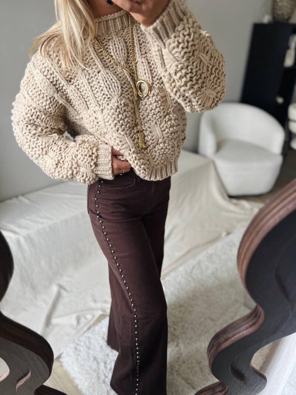 Deze heerlijke comfortabele jeans is een wide leg model. Hij is voor de wat kleinere dames, tot een lengte van 1,65/1,70. Er zit stretch in en hij is high wasited. De jeans valt op maat. Het model op de foto is 1,63 en draagt maat 34.