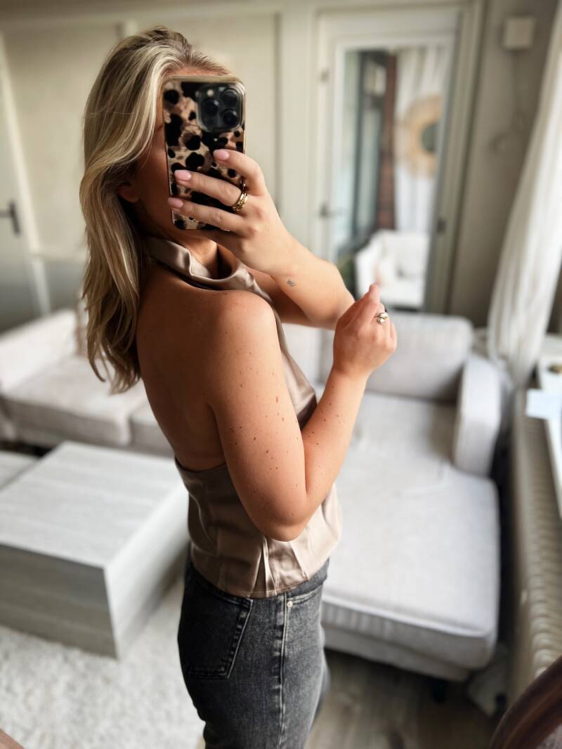 We hebben weer een nieuwe top, die super leuk is voor een feestje of wanneer je uit eten gaat. Hij heeft een lage achterkant wat erg chique lijkt. Hij is in de nek te sluiten met knoopjes. De top valt op maat.