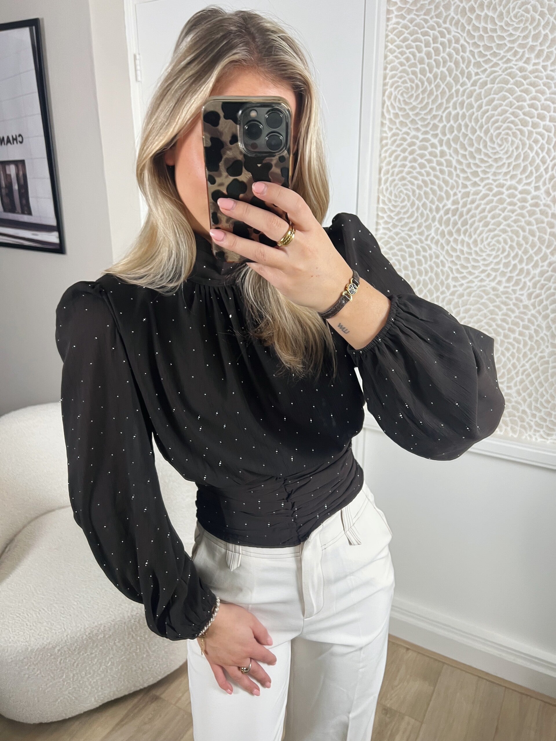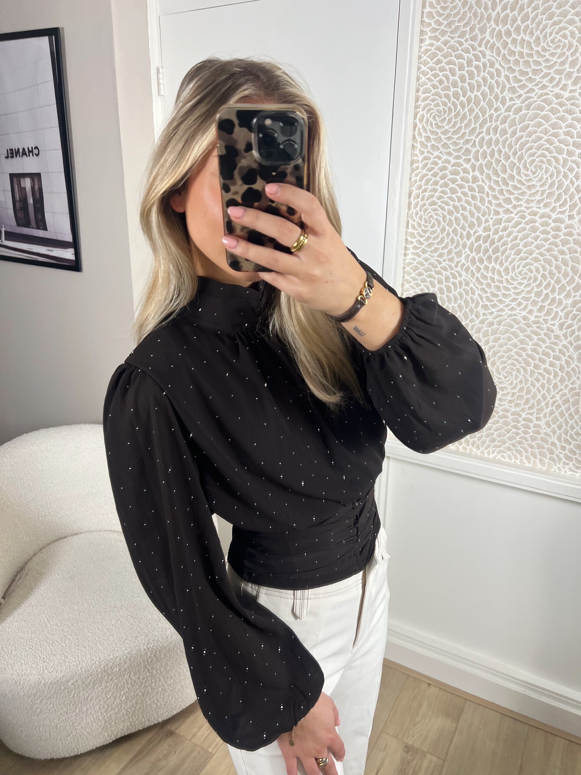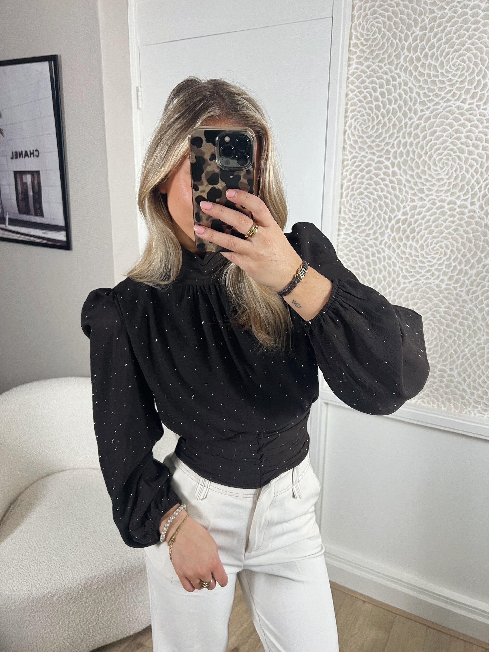 Deze super schattige blouse heeft een hoge kraag met een knoopsluiting in de nek. In de taille zit stretch waardoor hij altijd mooi aansluit. Het is een iets korter model. De blouse valt op maat.