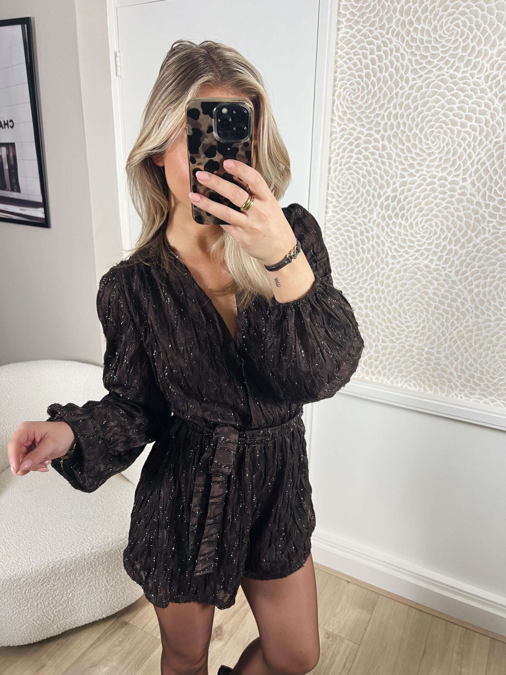 Dit is toch wel echt een must have deze winter. De playsuit is super feestelijk en heeft een subtiel glinsterend draadje door de print waardoor hij erg chique oogt. Er zit een ceintuur omheen. De playsuit valt een maat kleiner.