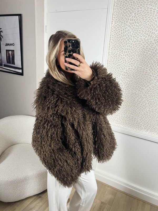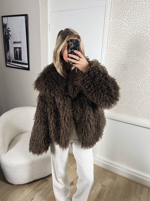 Deze heerlijke jas is mega comfortabel en lekker warm. Het is een hele zachte kleur bruin wat maakt dat hij overal bij past. Je kunt de jas sluiten met haakjes en oogjes. De jas is one size en te dragen van XS tm L.