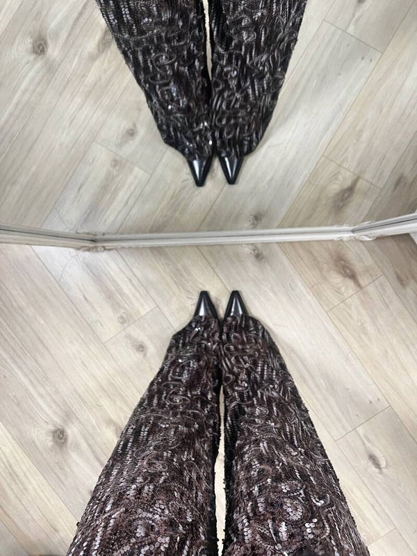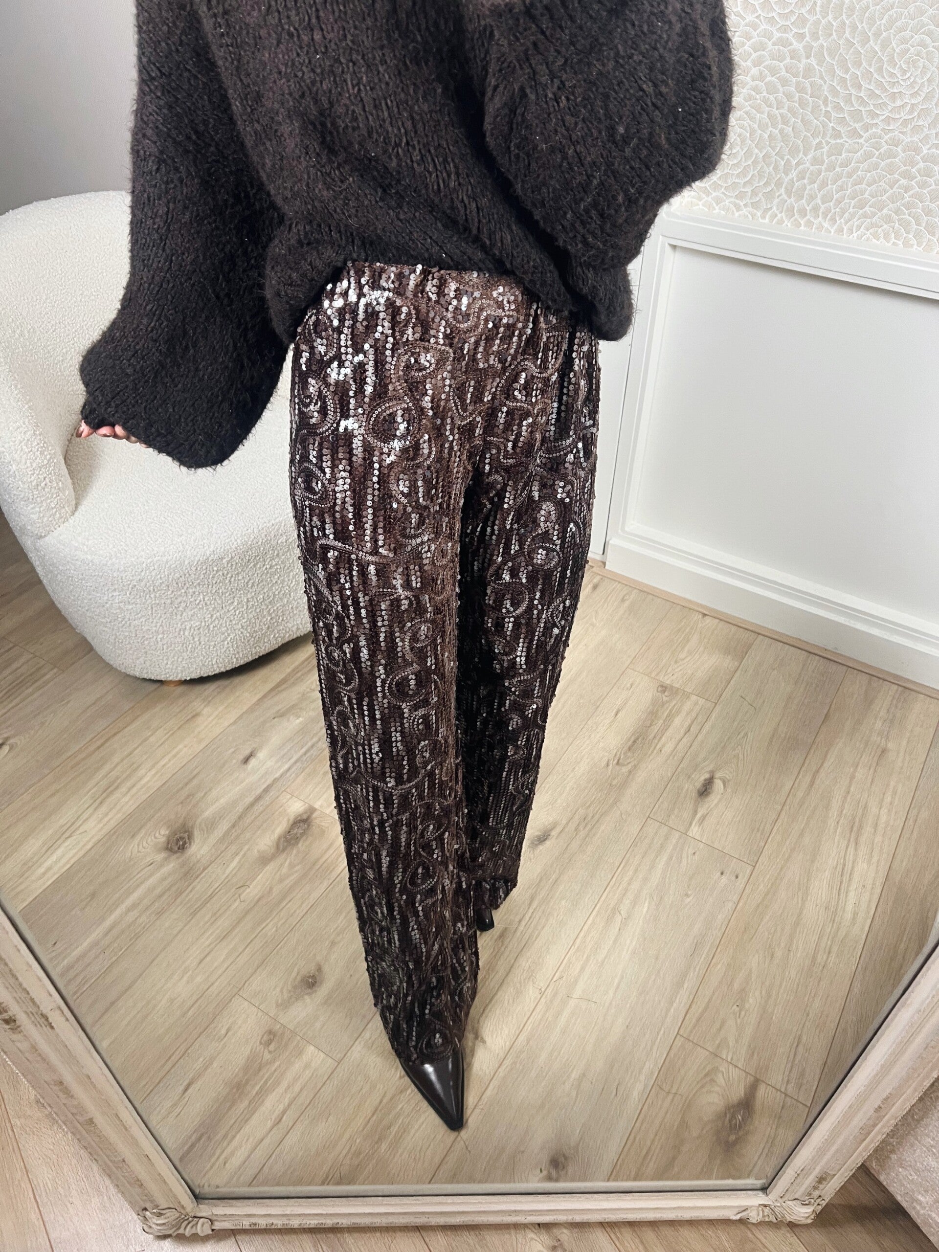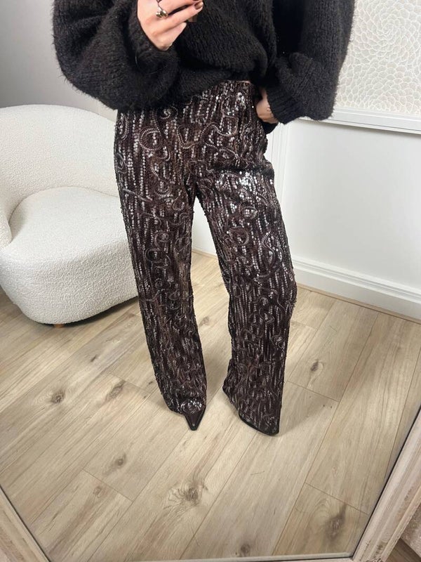 Deze broek is helemaal leuk voor als je van comfy en pailletten houdt. Hij is namelijk super leuk te combineren met een oversizede bruine trui. Er zit stretch in de broek en hij valt op maat.