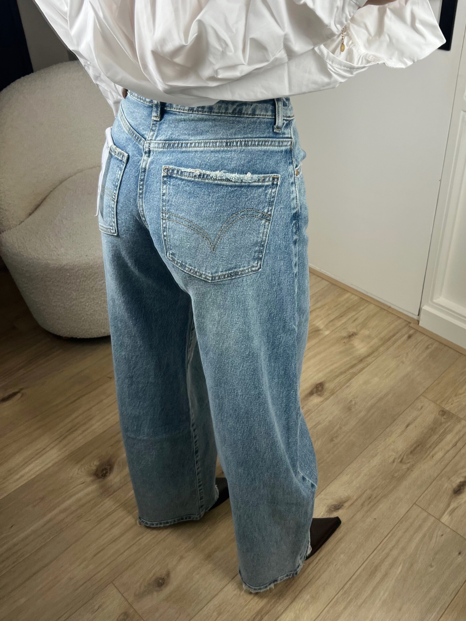 Deze prachtige jeans heeft een hele mooie wassing en een stoere fit door het barrel model. Hij valt iets korter, maar bij een balloon fit is het niet storend wanneer hij iets korter is. Het model op de foto is 1,63 en draagt S. De jeans valt een halve maat kleiner en is mid waist.
