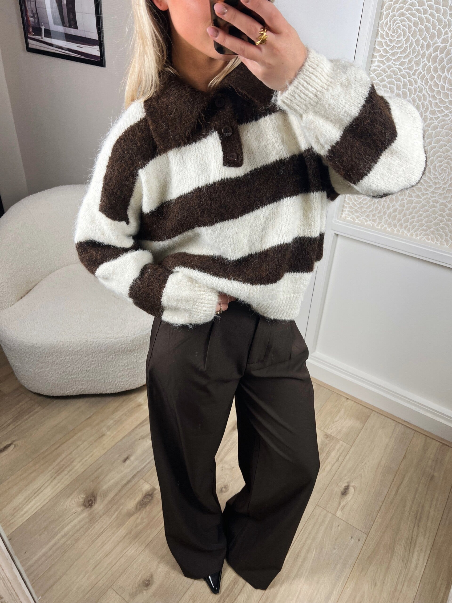 Deze super leuke trui van het merk Ambika is helemaal trendy. Hij heeft beige met bruine strepen. De trui heeft 8% wol.