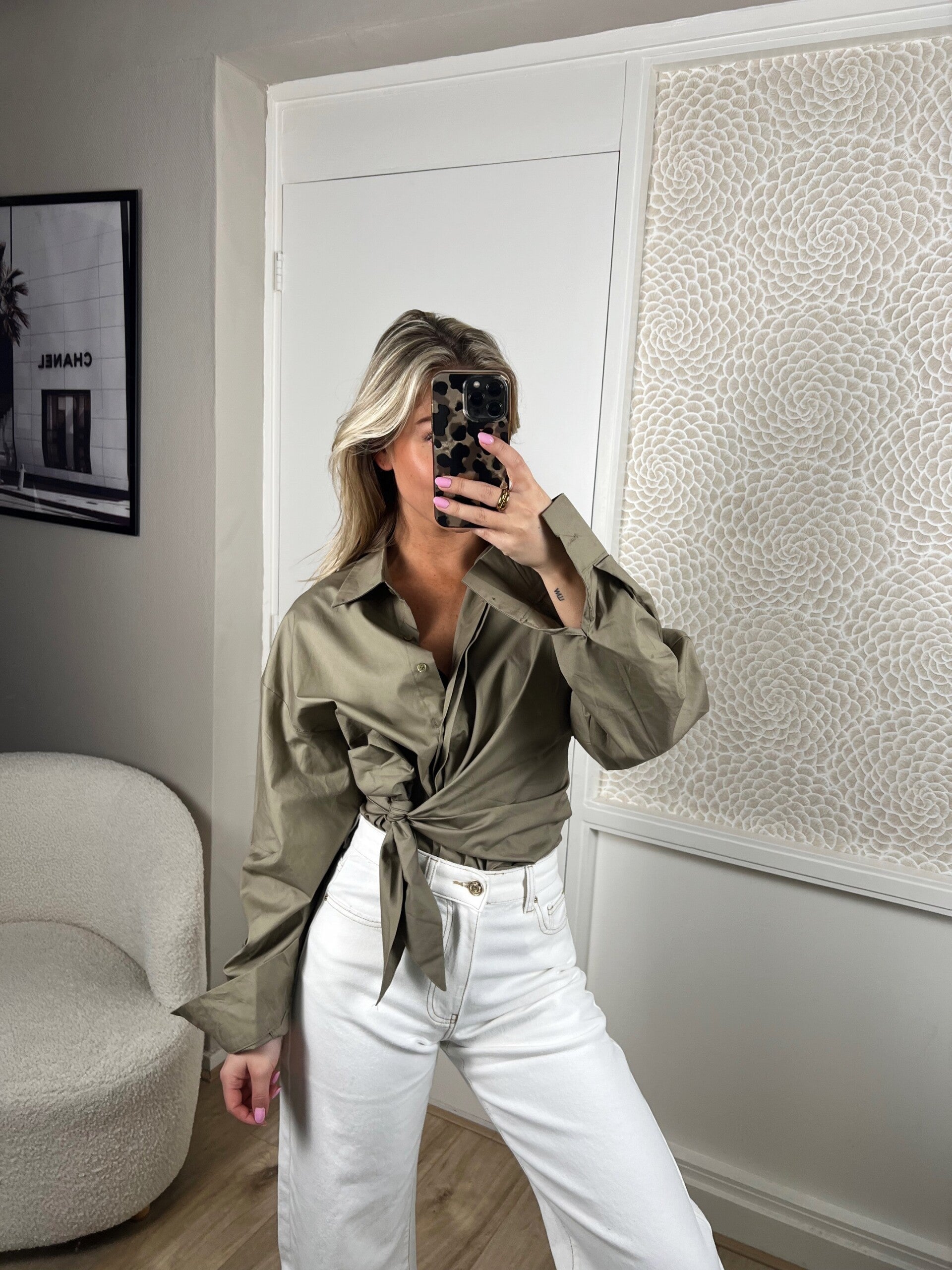 Deze super leuke blouse is een goede basic, maar door de strik nét even iets leuker. Het is een prachtige groen/bruine kleur, en leuk te combineren met beige en wit. De blouse valt op maat.