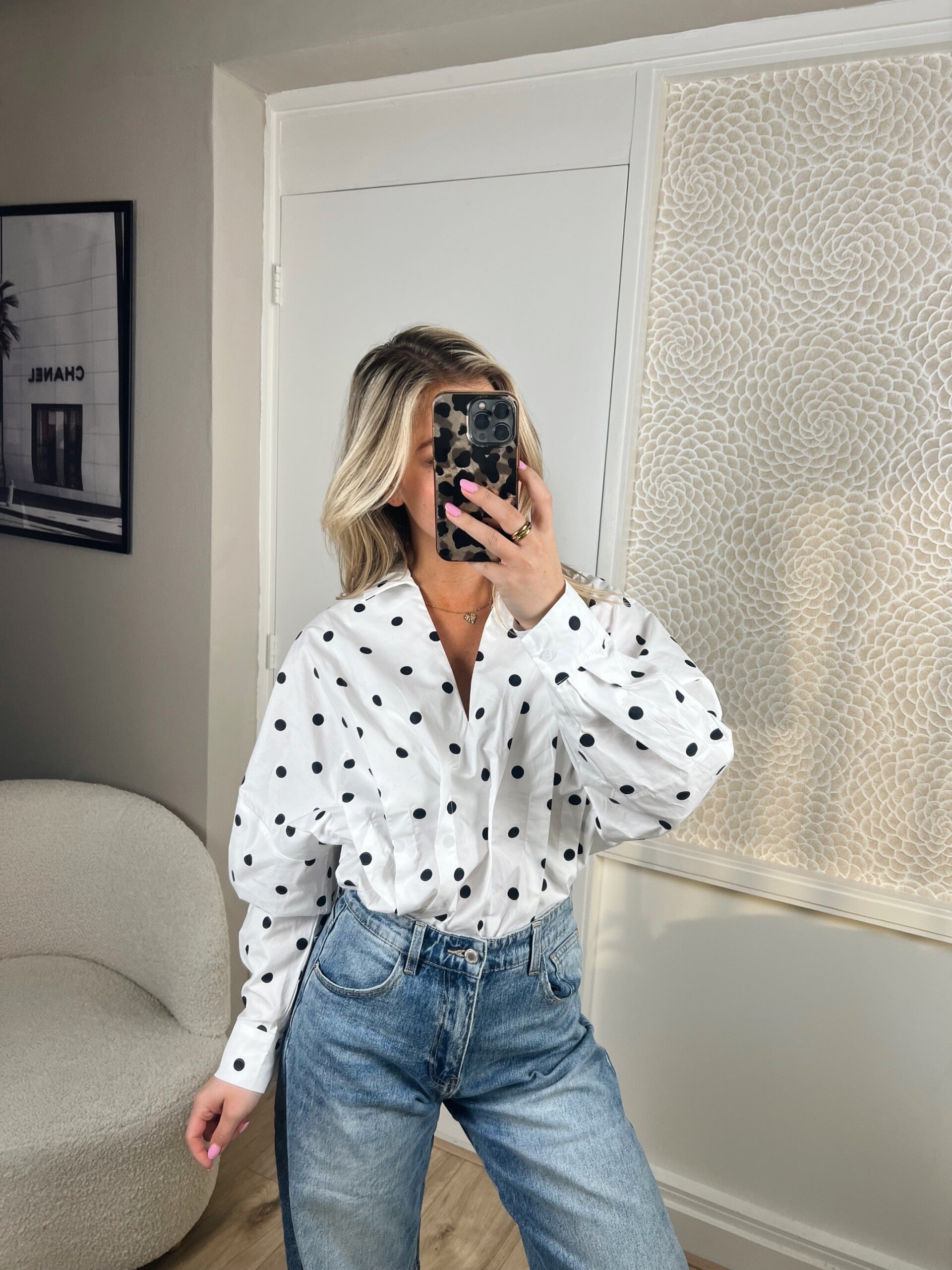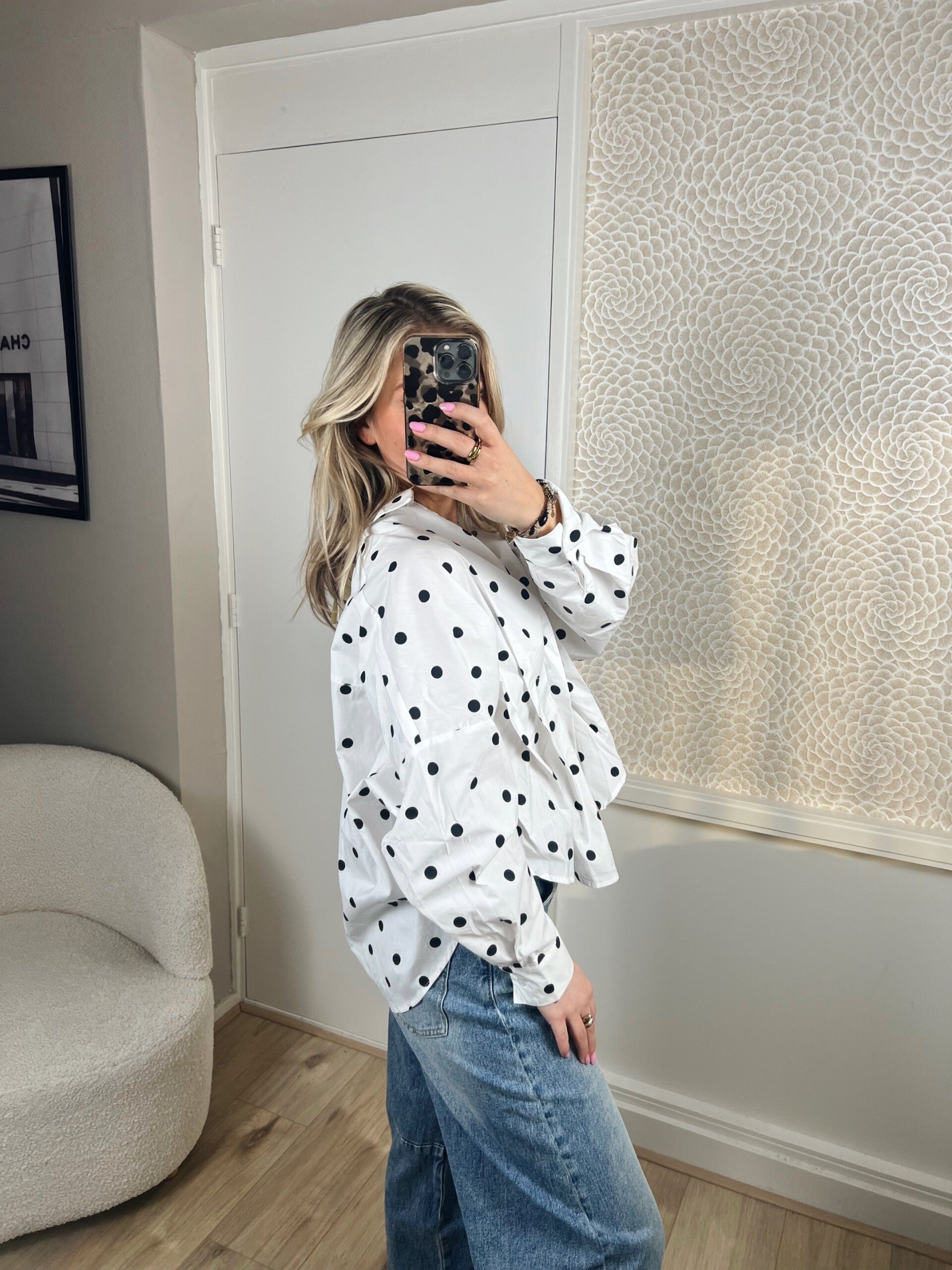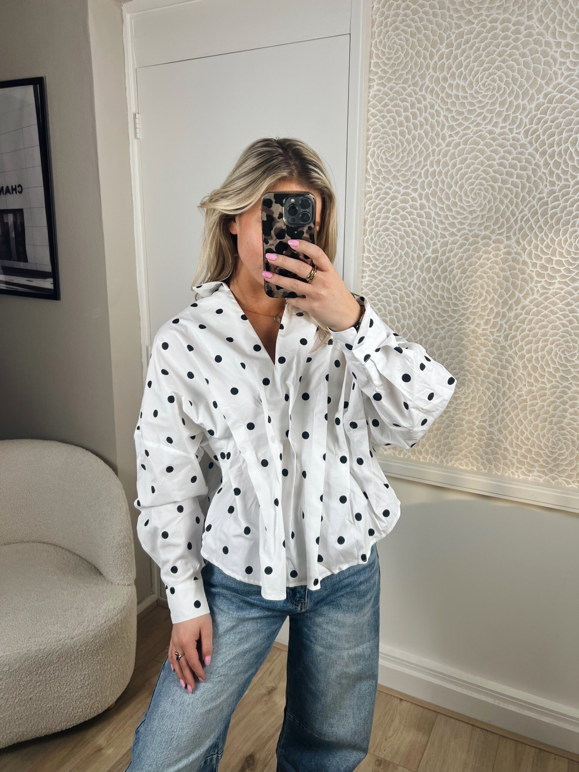 Dit super leuke blousje heeft een heel mooi getaileerd model, en valt aan de bovenkant wat wijder. Hele leuke details door de polkadots. De blouse valt op maat.
