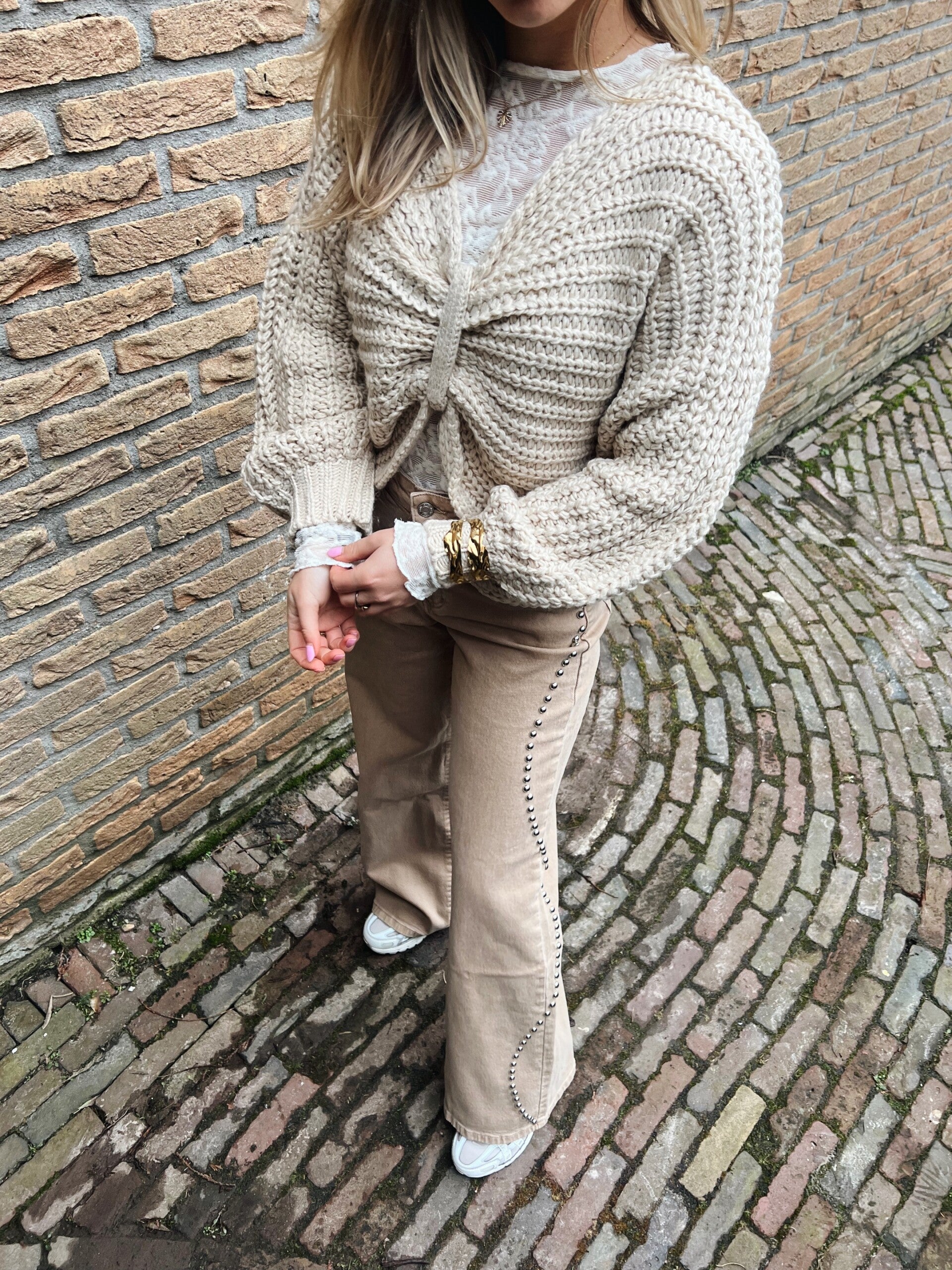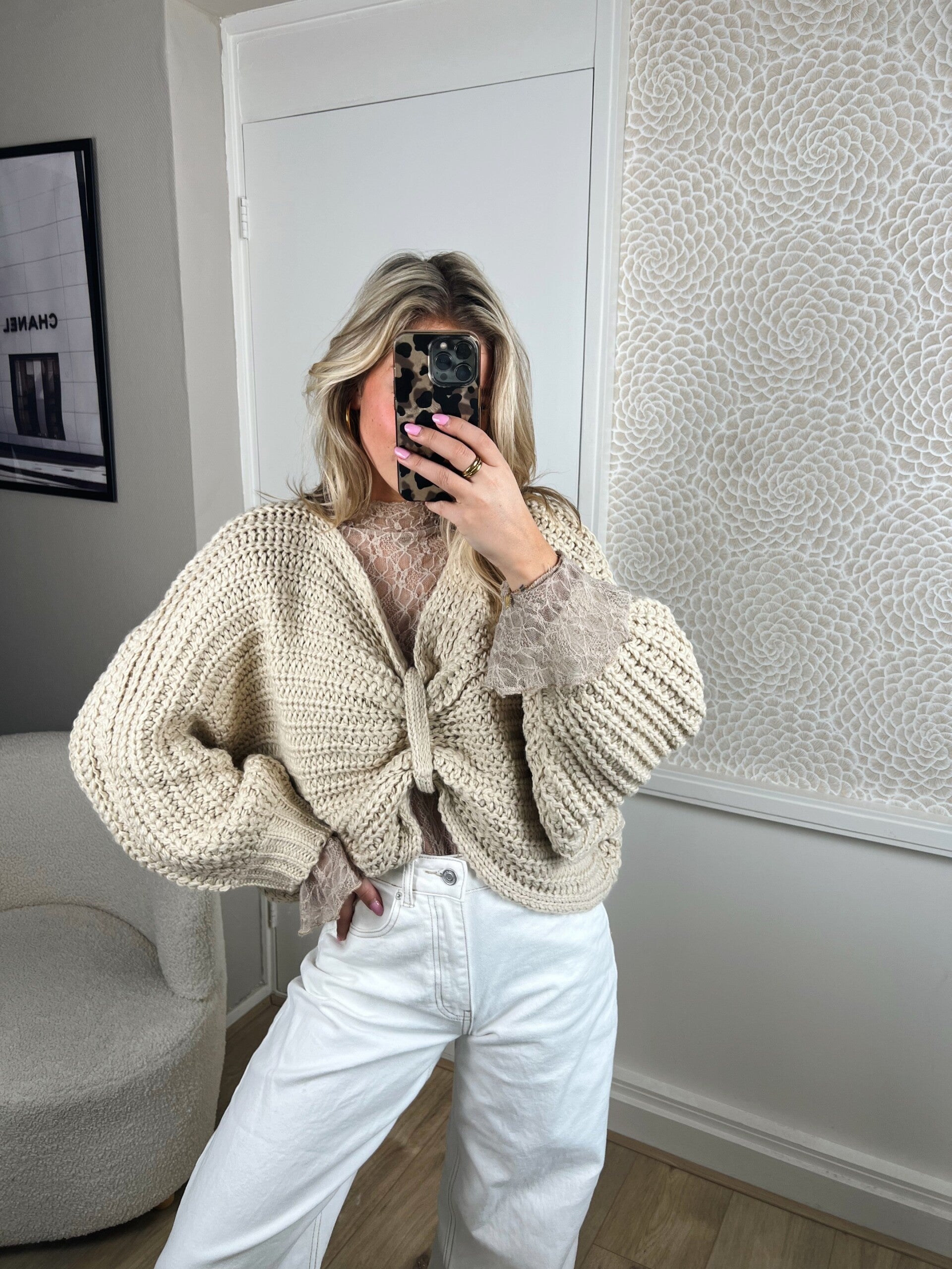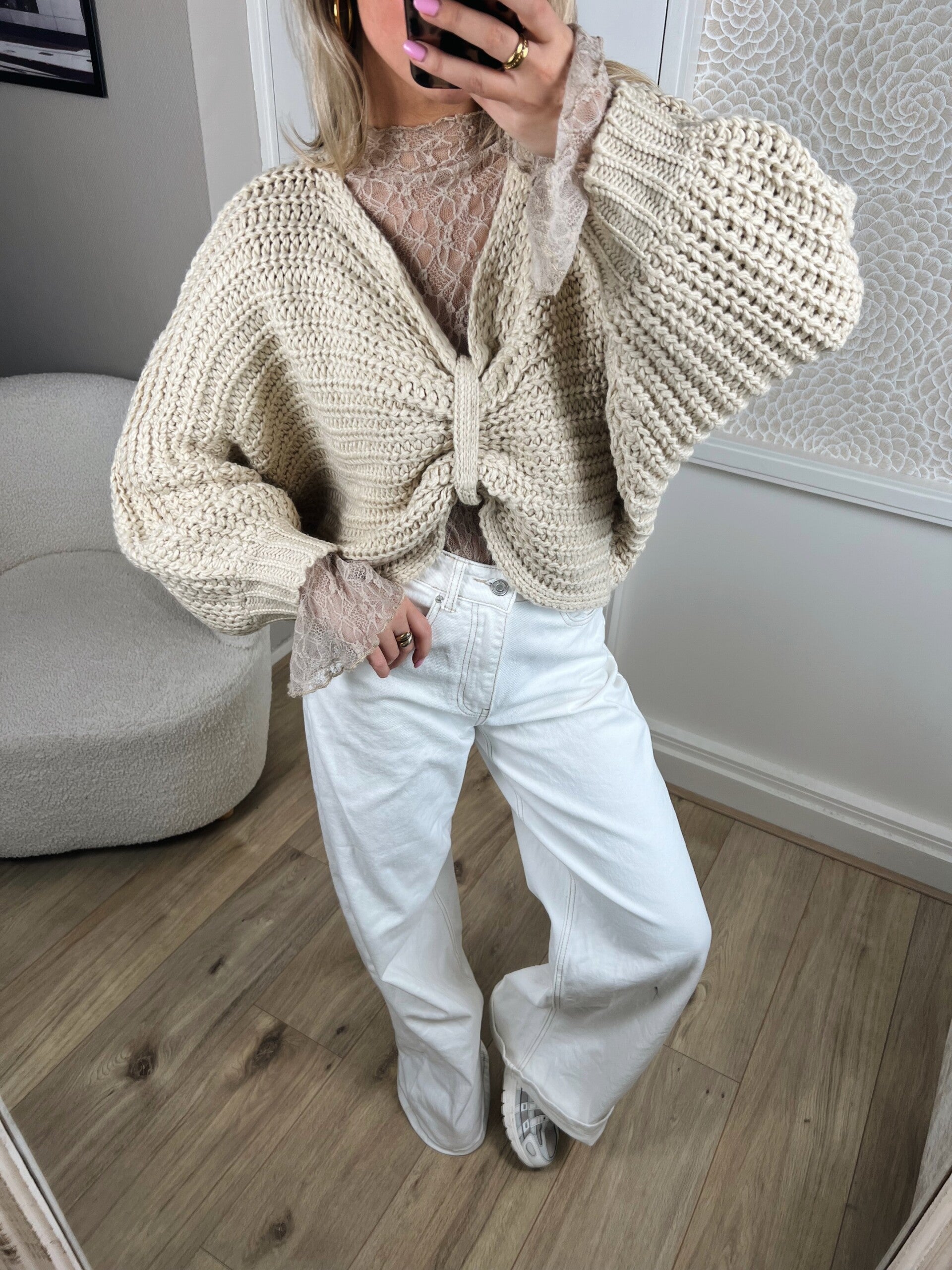 Deze super leuke trui kun je op twee verschillende manieren dragen. Hij is super leuk met de kanten top beige eronder. Ook een bruine kanten top staat er super leuk bij. De trui is one size en te dragen van XS tm XL.