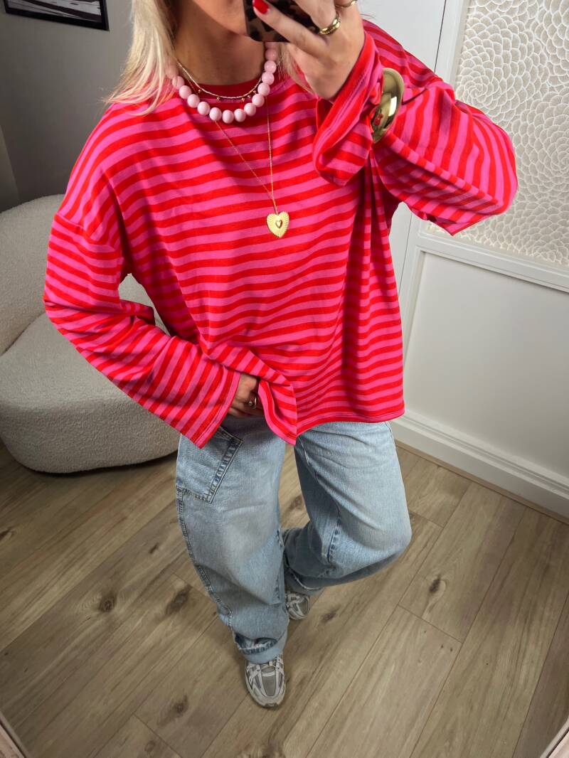 Longsleeves zijn weer helemaal terug van weggeweest. En hoe leuk met een streepje erin. De kleuren zijn beige met wit. Het shirt heeft een leuk uitlopend mouwtje. De longsleeve is one size en te dragen van XS tm XL.