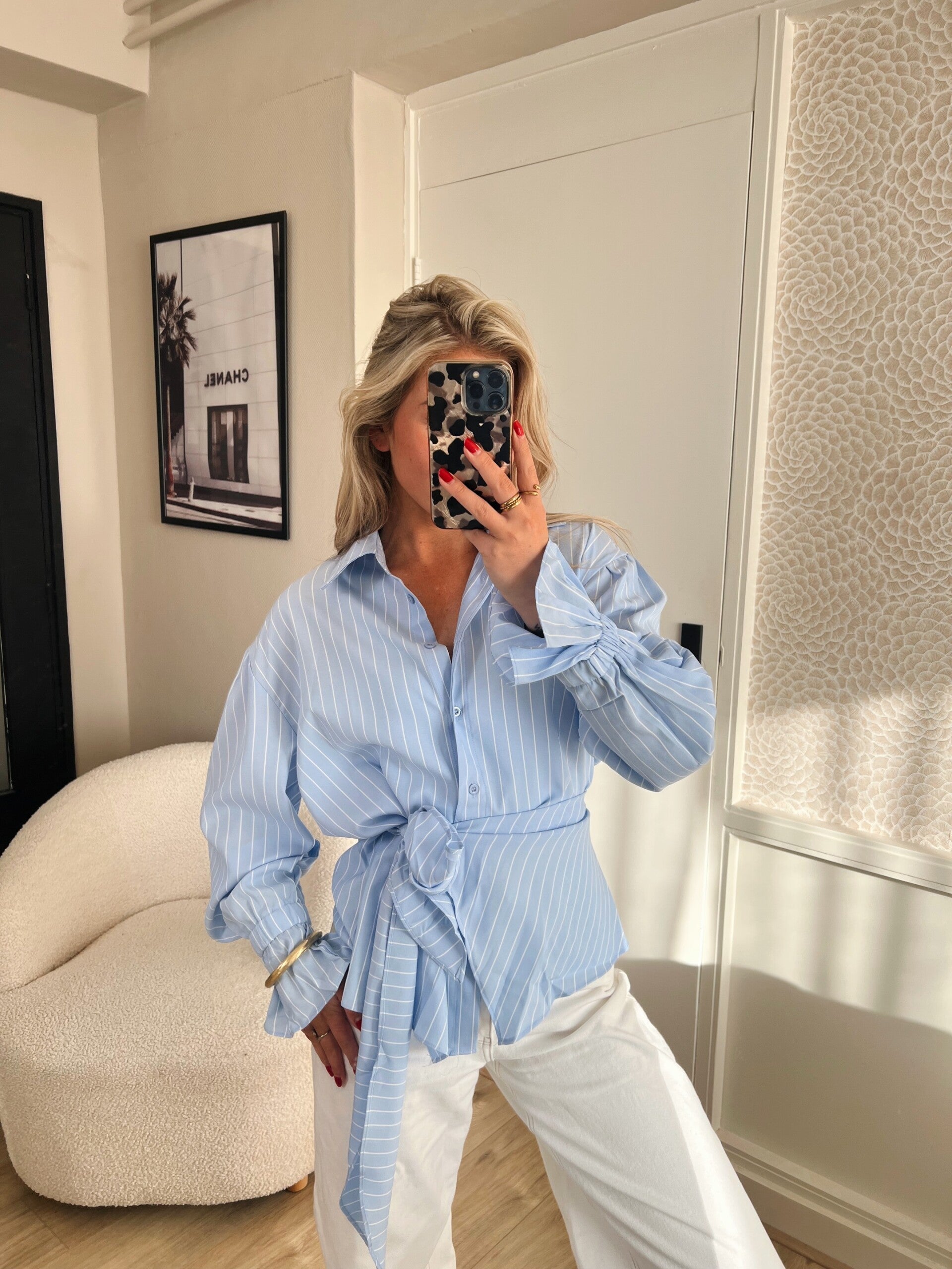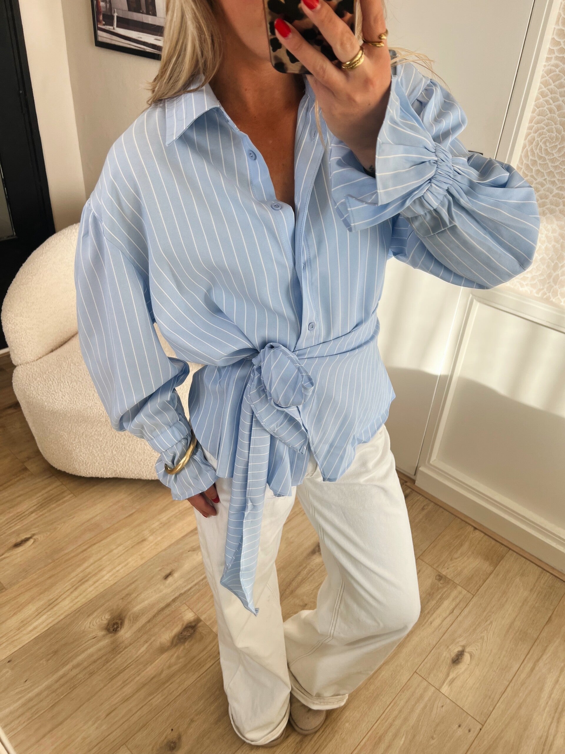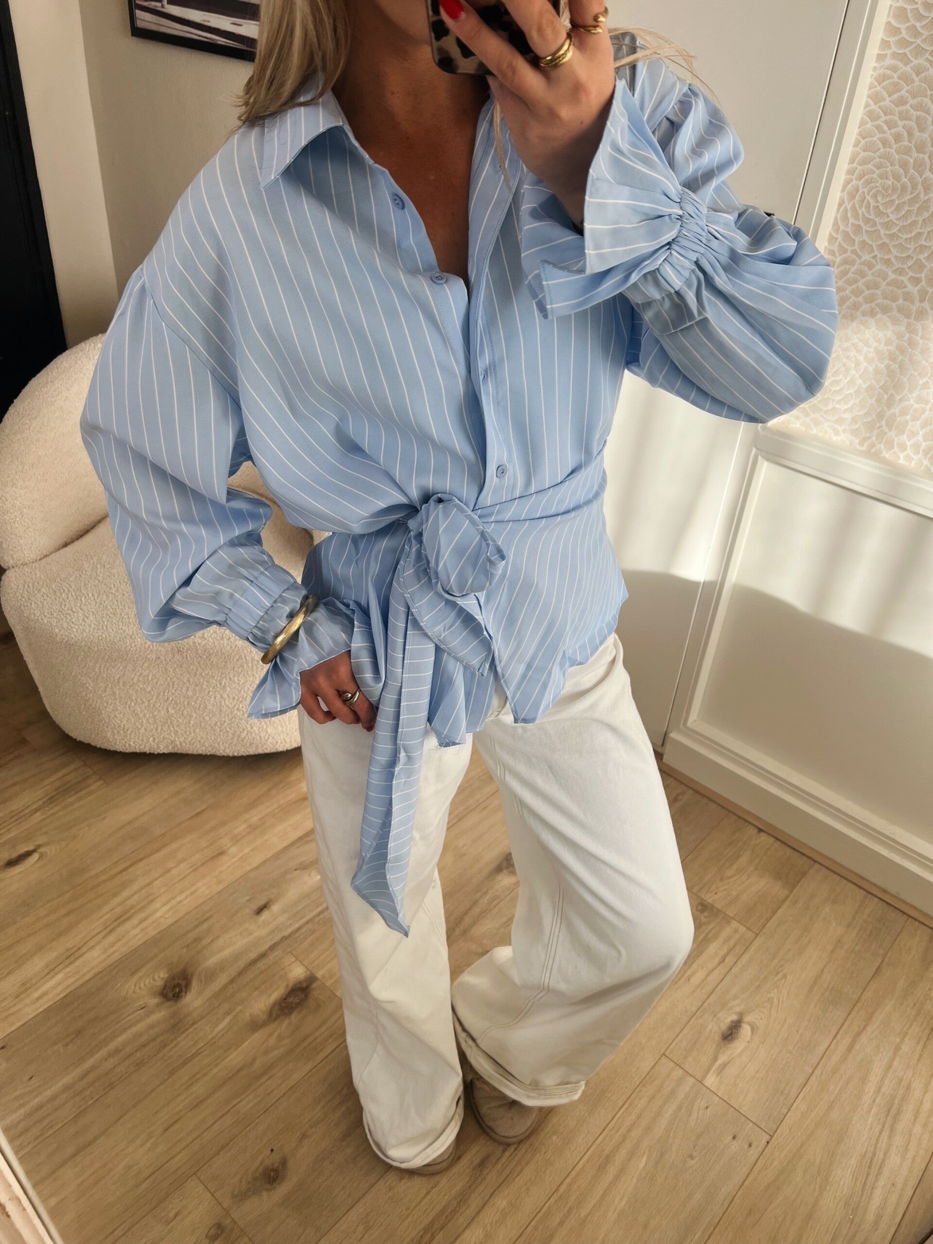 We hebben weer een nieuwe overslag blouse binnen! Dit keer met een erg leuk plooi mouwtje en een licht streepje in de stof. De blouse valt op maat.