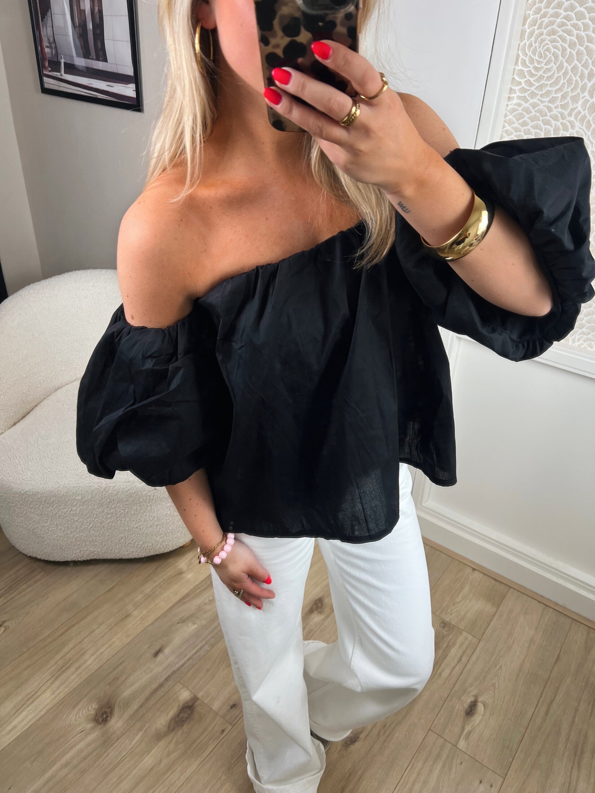 Deze top is echt een musthave dit seizoen. De top heeft leuke pofmouwtjes en valt wat oversized. Er zit een elastieke band in waardoor hij altijd goed aansluit. De top is one size en te dragen van XS tm L.
