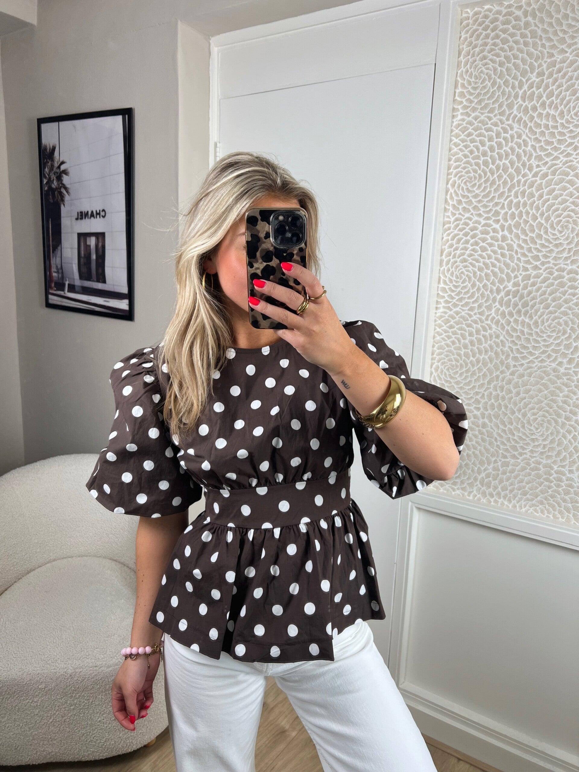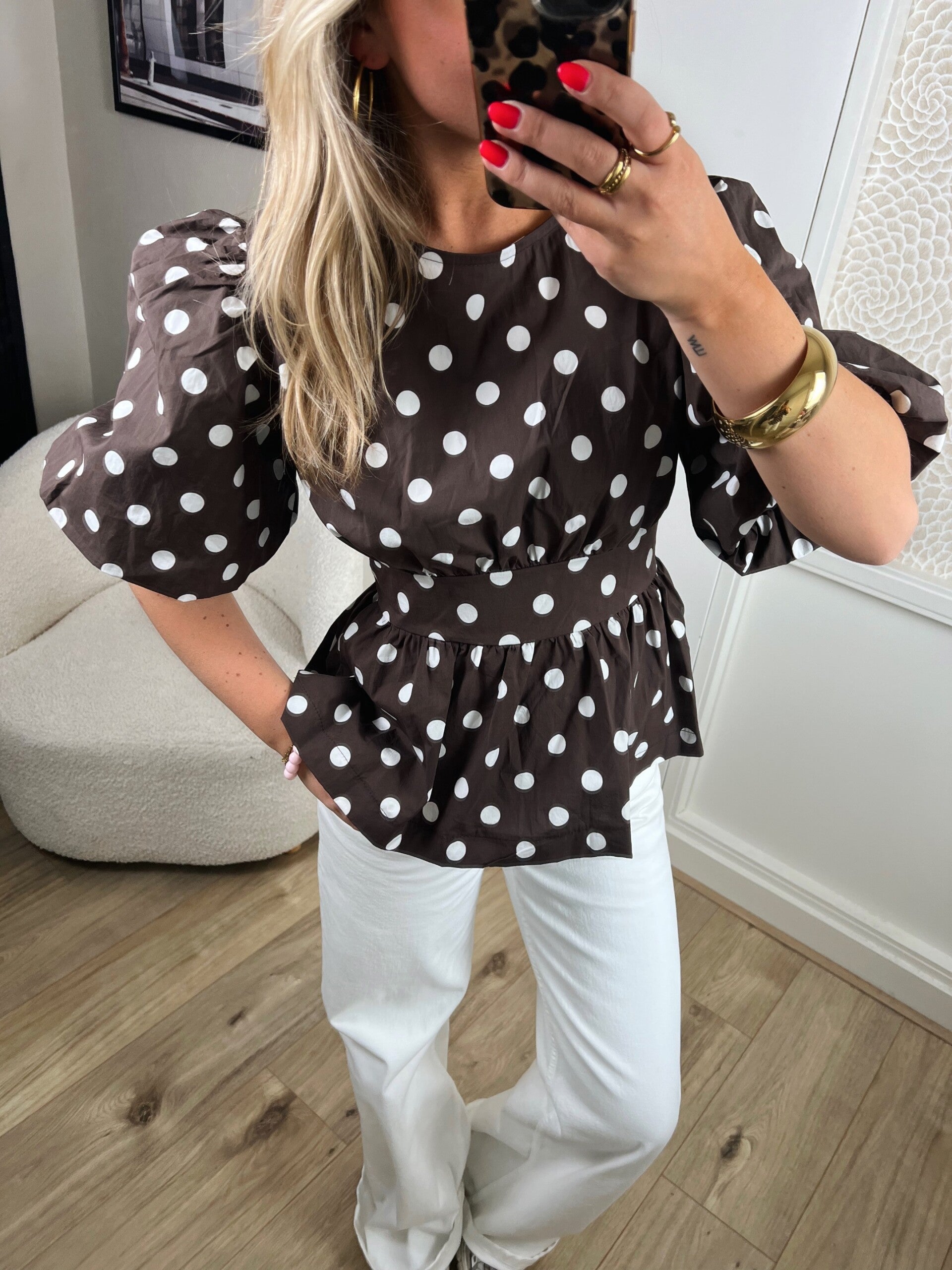 YAY! Onze bestseller van vorig jaar is terug! Deze top heeft prachtige pofmouwen en een strik op de achterkant. Hiermee kun je de top heel mooi getailleerd maken. De top is one size en te dragen van XS tm L.